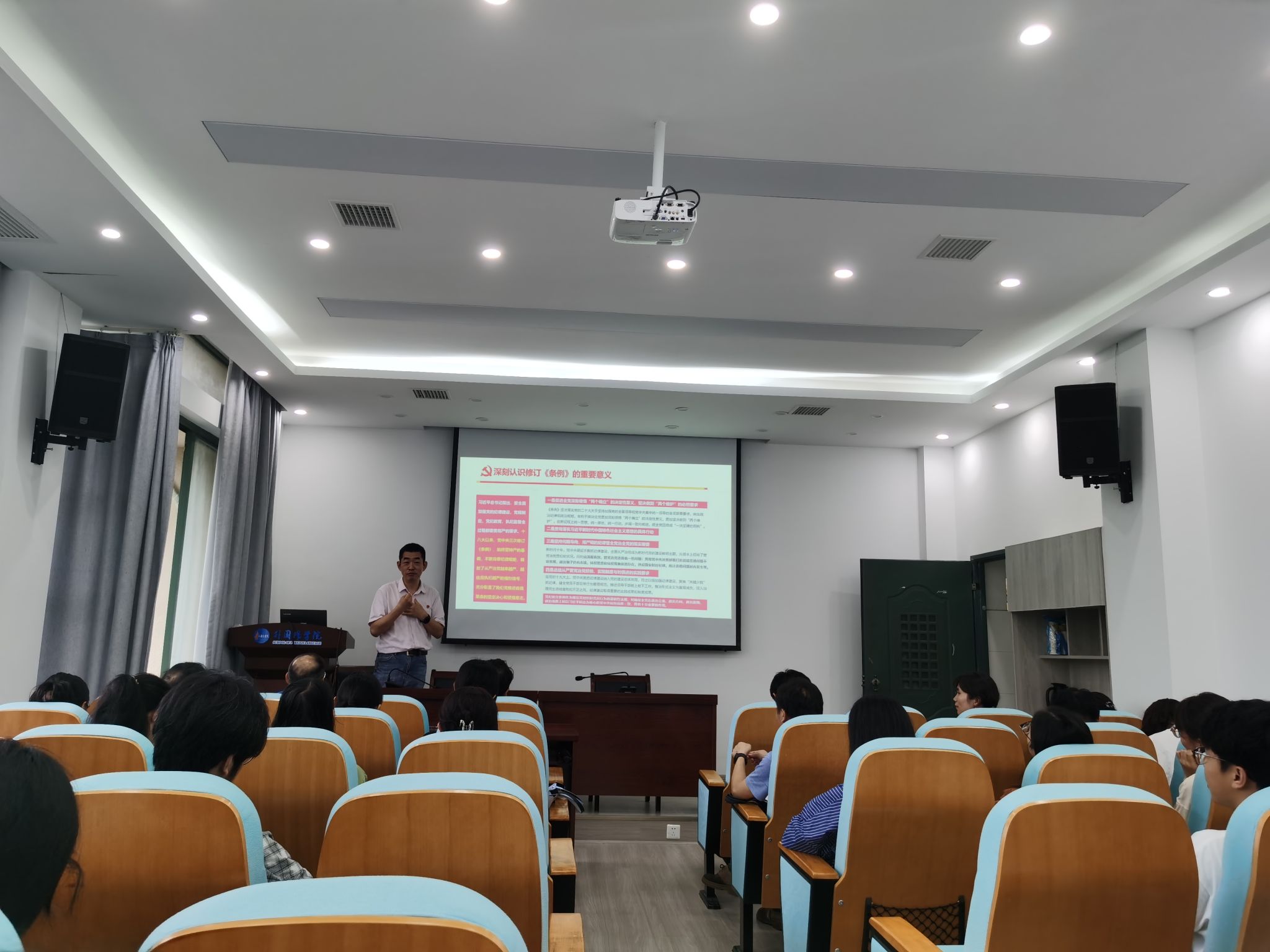6月18日下午,副校长李培生为研究生院、外国语学院、国际教育学院师生党员讲授党纪学习教育专题党课。