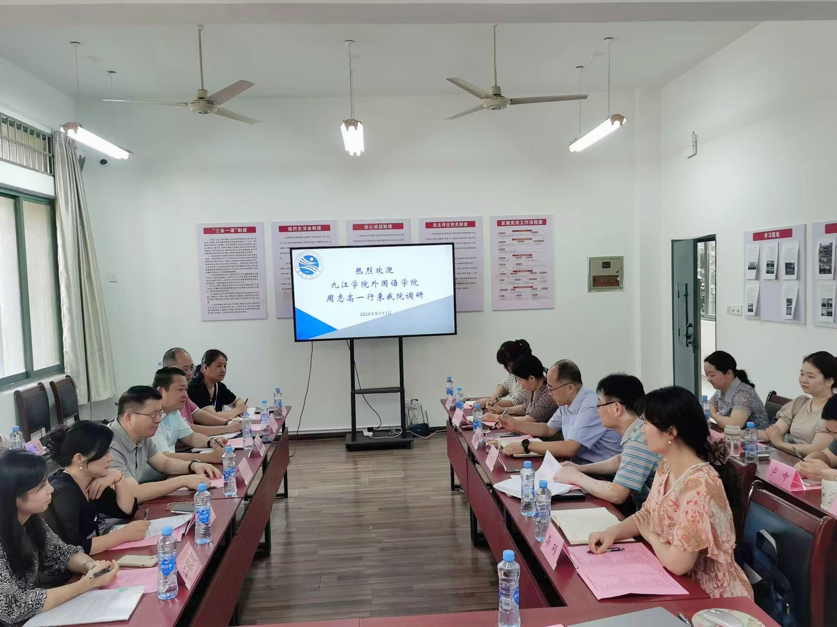9月13日上午,九江学院外国语学院院长周志高一行10人来我院调研交流,就本科教育教学审核评估、硕士学位授权点申报以及大学外语教学改革等议题进行深入探讨。外国语学院全体班子成员、部分教研室主任、专业负责人和相关工作人员参加座谈。