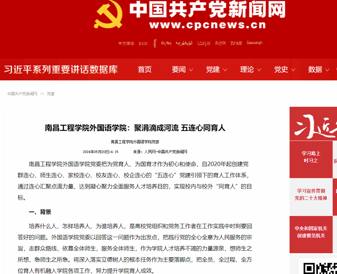 近期,中国共产党新闻网刊发了外国语学院党委“问渠”党建品牌的经验做法文章,题目为:“南昌工程学院外国语学院:聚涓滴成河流 五连心同育人” 。