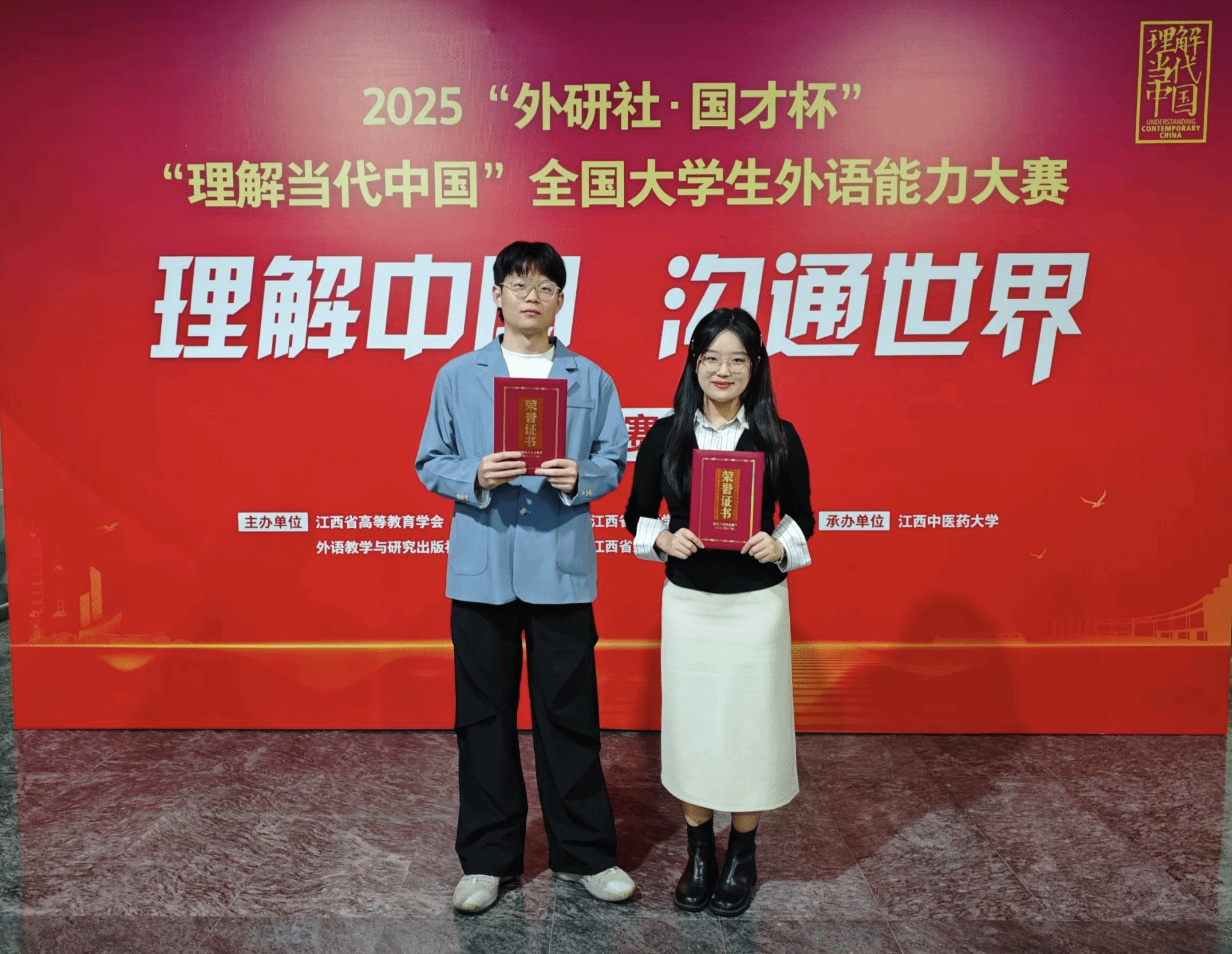 11月2日,2025“外研社·国才杯”“理解当代中国”全国大学生外语能力大赛江西赛区口译复赛在江西中医药大学圆满落幕。我校外国语学院22级英语4班周晓娟、25级翻译硕士学生揭麒祥凭借出色的表现斩获了该项赛事两项银奖。