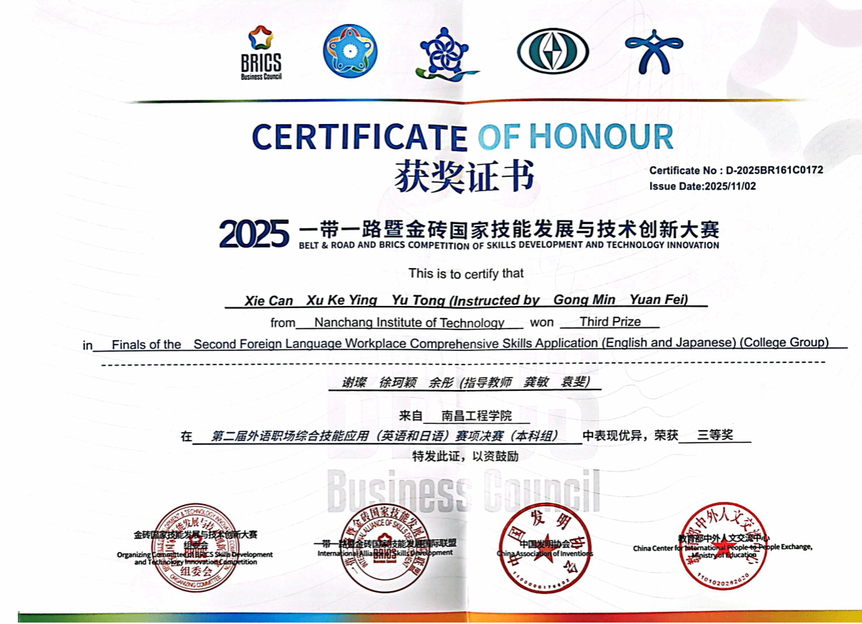2025年度“一带一路”暨金砖国家技能发展与技术创新大赛第二届外语职场综合技能应用(英语和日语)赛项全国总决赛圆满落幕。外国语学院谢璨、徐珂颖、余彤三位同学组成的团队凭借扎实的语言功底、出色的职场素养与默契的团队协作荣获全国决赛三等奖。
