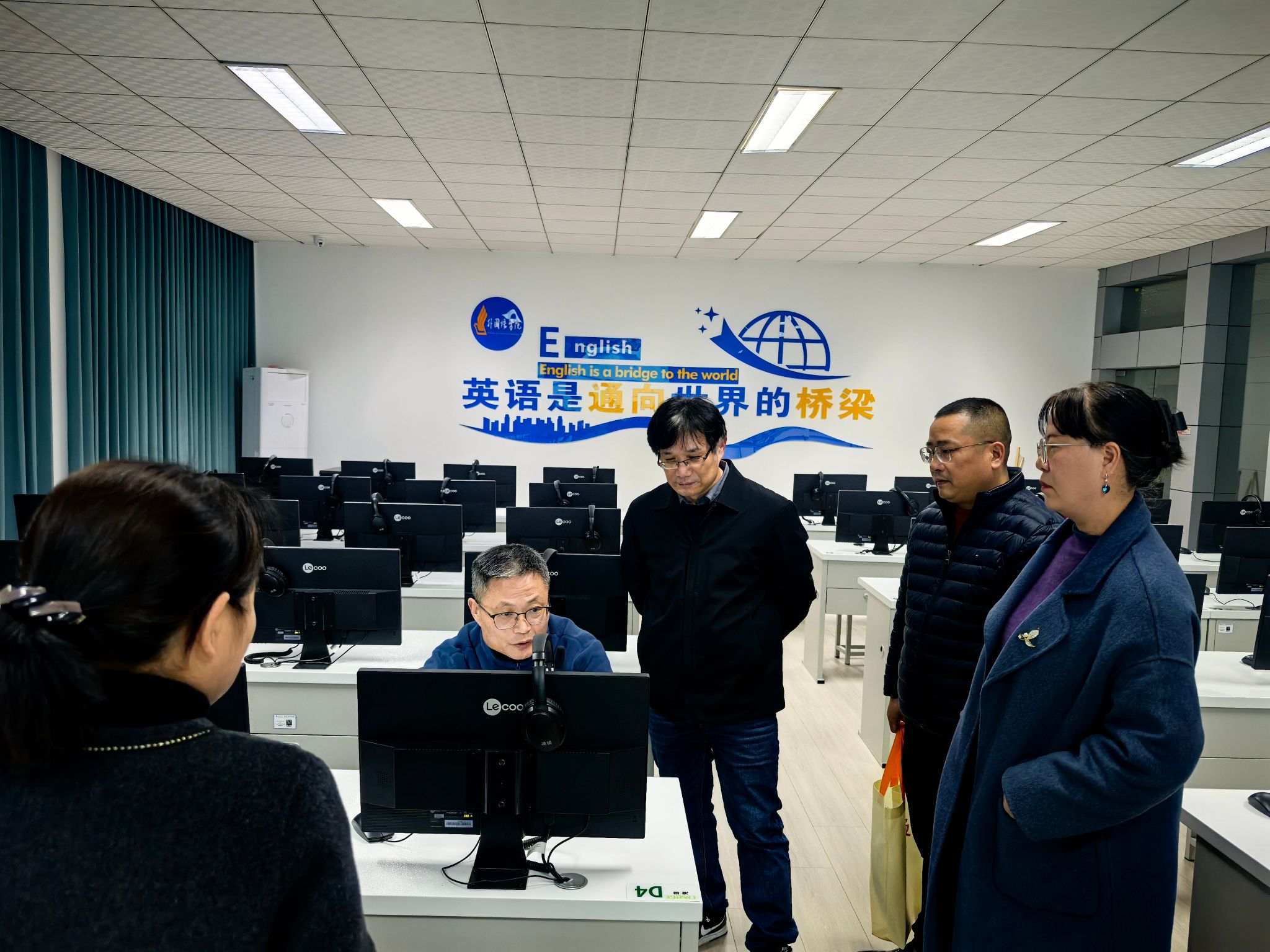 交流期间,刘悦明院长一行实地参观了我院实验室,详细了解学院在智慧教学、语言实训等方面的建设成效。
