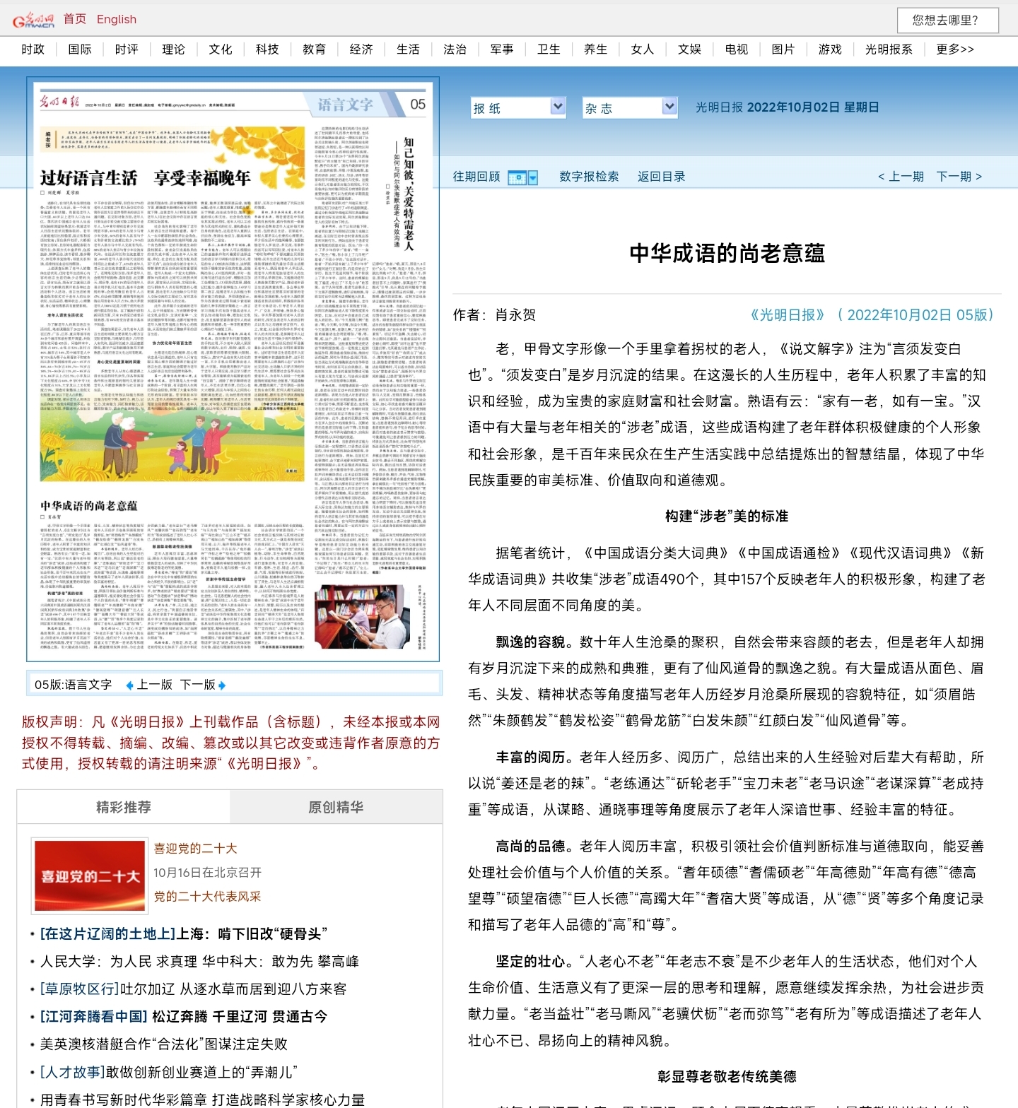 10月2日,学院肖永贺副教授在《光明日报》发表理论文章《中华成语的尚老意蕴》。文章指出中华成语富含大量与老年相关的“涉老”成语,这些成语从飘逸的容貌、丰富的阅历、高尚的品德、坚定的壮心等四个方面构建了“涉老”美的标准,并提出这些成语彰显了我国尊老敬老的传统美德,折射了中华传统的生命哲学。(文/图 林青霞)