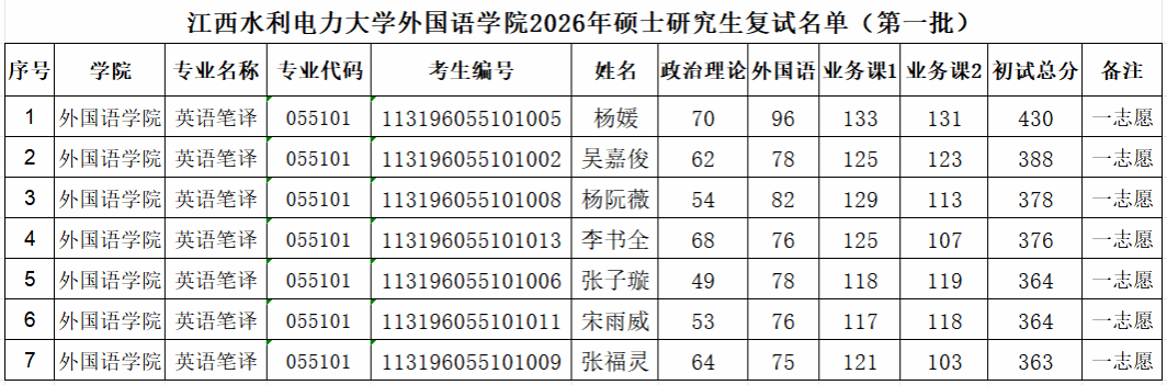 江西水利电力大学外国语学院2026年硕士研究生复试成绩公示表(一志愿)