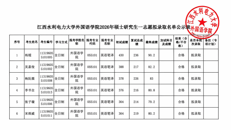江西水利电力大学外国语学院2026年硕士研究生一志愿拟录取名单公示表