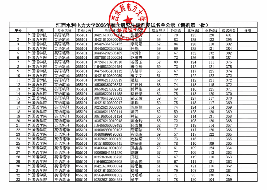 江西水利电力大学2026年硕士研究生调剂复试名单公示(调剂第一批)