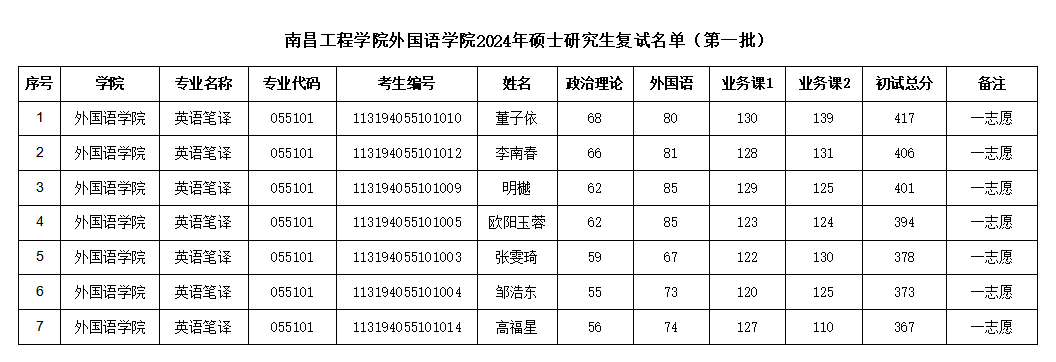 南昌工程学院外国语学院2024年硕士研究生复试名单(第一批)