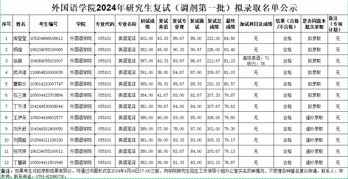 外国语学院2024年研究生复试(调剂第一批)拟录取名单公示