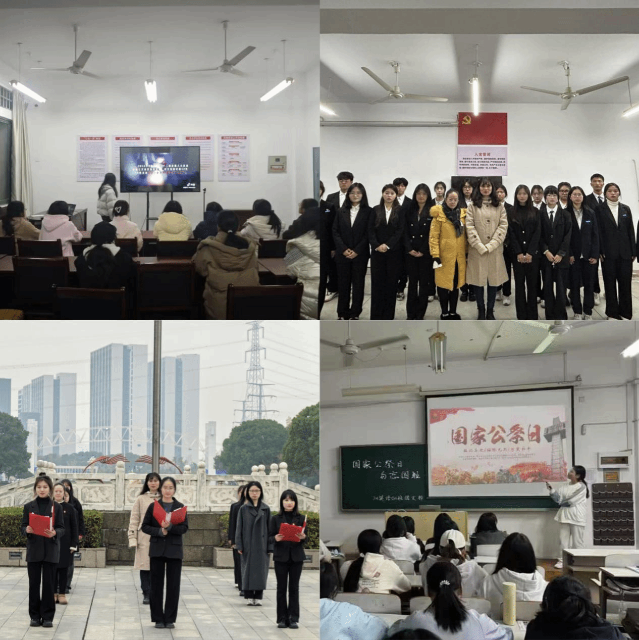 主题活动以多样的方式开展,班级采取了播放相关视频、默哀等方式,开展以勿忘国耻、圆梦中华为主题的团日活动;学生党支部开展了学生采访以及国旗下的演讲主题党日活动;学院面向在校生举办“勿忘国难日,励志强国心”12·13国家公祭日主题演讲比赛,参赛选手用真挚的情感、生动的语言,讲述了一个个感人至深的爱国故事。