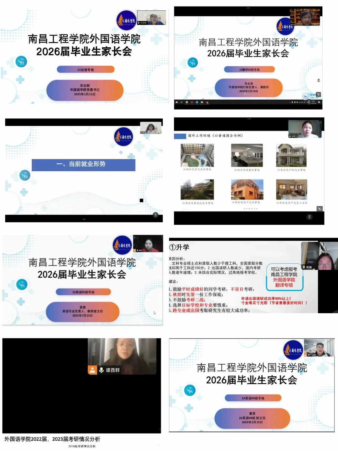 为推进2026届毕业生高质量就业,外国语学院于近日召开线上家长会。外国语学院班子成员、专业负责人、教研室主任、就业辅导员、班主任和2022级全体学生、家长线上参会。