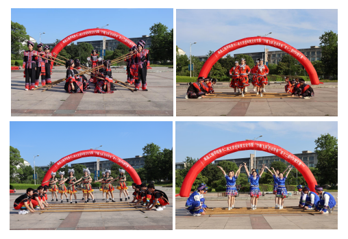 比赛现场,来自14个学院的参赛队各展风采。参赛队员们身着统一靓丽的民族服装,舞步整齐,随着竹竿的敲击节奏,灵活地在竹竿间跳跃穿梭,展现出精湛的技艺和青春的活力。