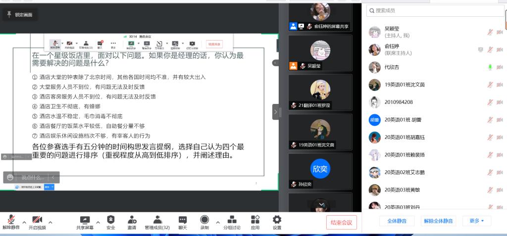 为提高学生综合素质,4月29日晚,外国语学院在腾讯会议举行“喜迎二十大 青春奋斗路”第八届无领导小组大赛的线上决赛。外国语学院党委副书记李硕、组织员何安平、团委书记王聪、辅导员林浩明等老师,来自各年级的参赛选手以及观众同学共同参与了比赛。