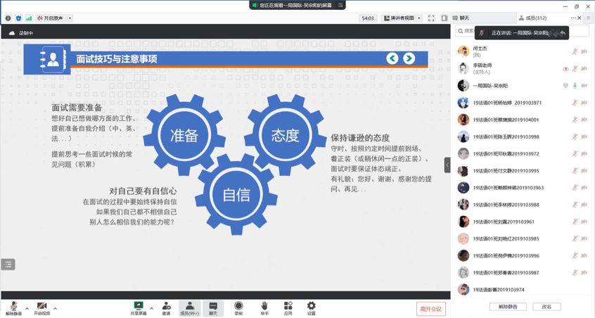 会上,吴宗阳就如何提高就业竞争力问题,根据当今的就业形势和自己多年来的就业指导实践,结合许多实际案例,为同学们系统梳理了实现个人高质量就业的方法和经验。随后,吴宗阳向大家分享了面试技巧与注意事项并抽取同学的简历进行指导,细心地解答了同学们提出的问题。