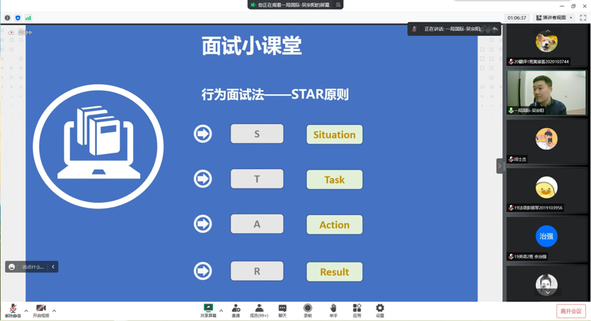 为引导外国语学院广大学生科学规划大学学习与生活,提升我院学生职业发展方向认知与职业生涯规划能力,2022年8月12日,外国语学院邀请了中国水电一局国际公司人力资源部吴宗阳开展了第三期“人力资源说生涯”就业指导讲座。本次讲座由外国语学院辅导员章昱主持。