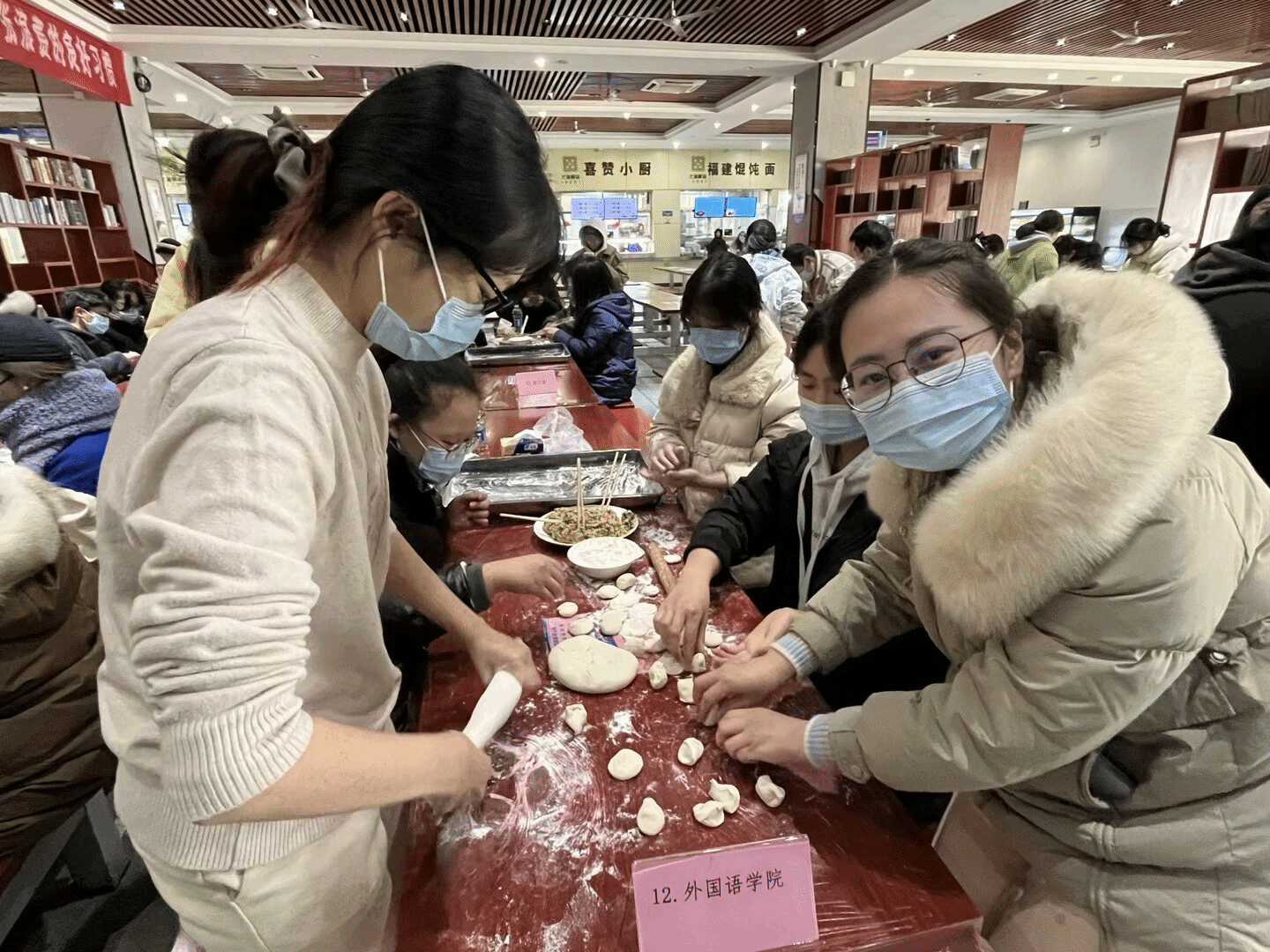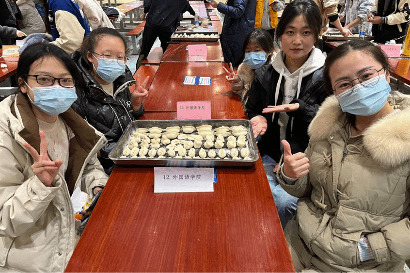 活动开始时,同学们欣赏了双截棍表演,在主持人宣布活动开始后,场内展开了激烈的包饺子比赛。学生们纷纷热情参与,包出造型各异的饺子,随着热腾腾的饺子陆续出锅,师生们围坐在一起,交流着学业与生活,在欢声笑语中享受着温馨美好的晚餐和冬季独有的温暖。外国语学院在此次包饺子大赛中获得二等奖。