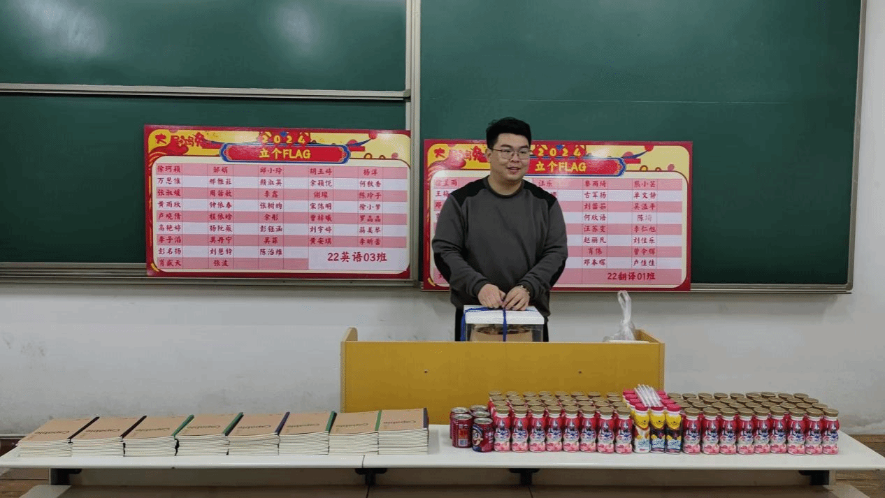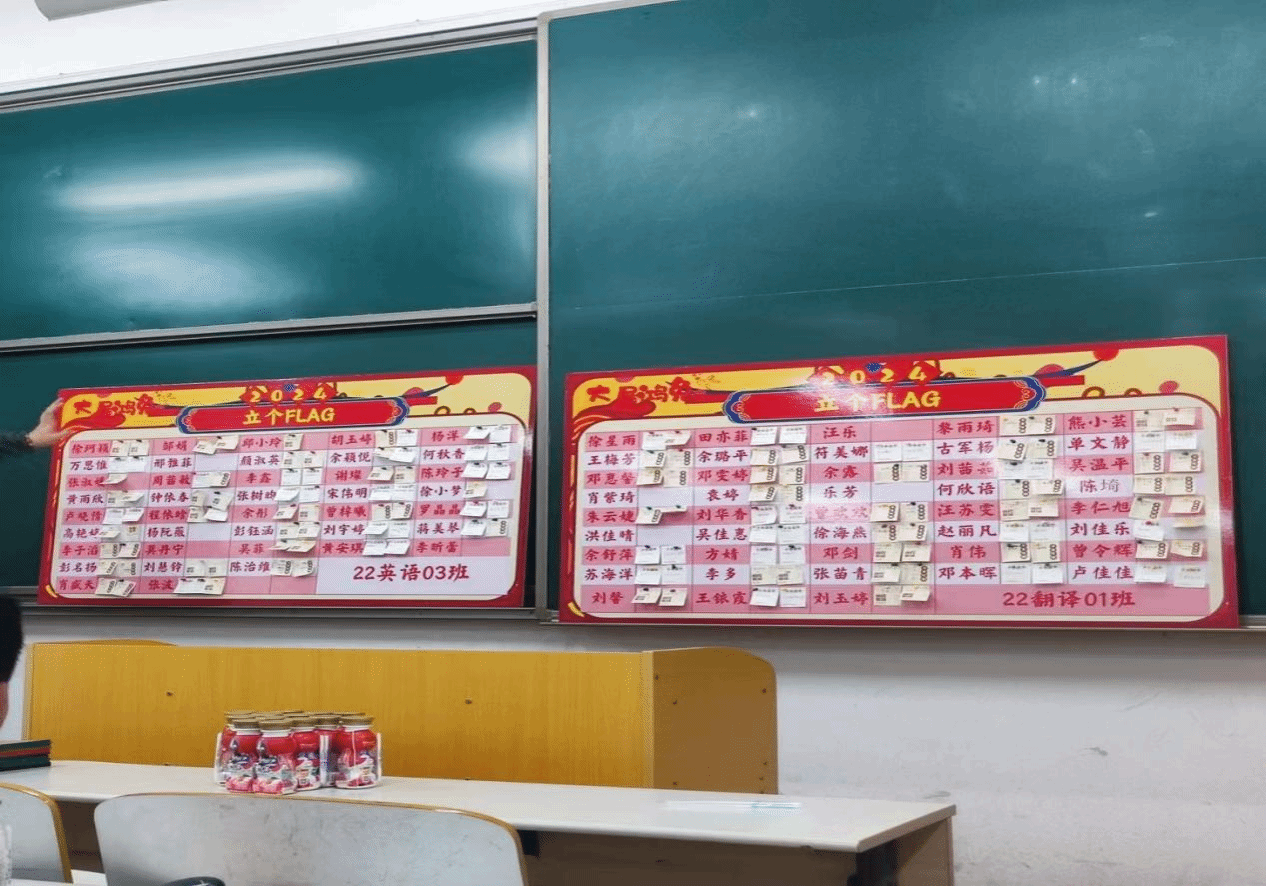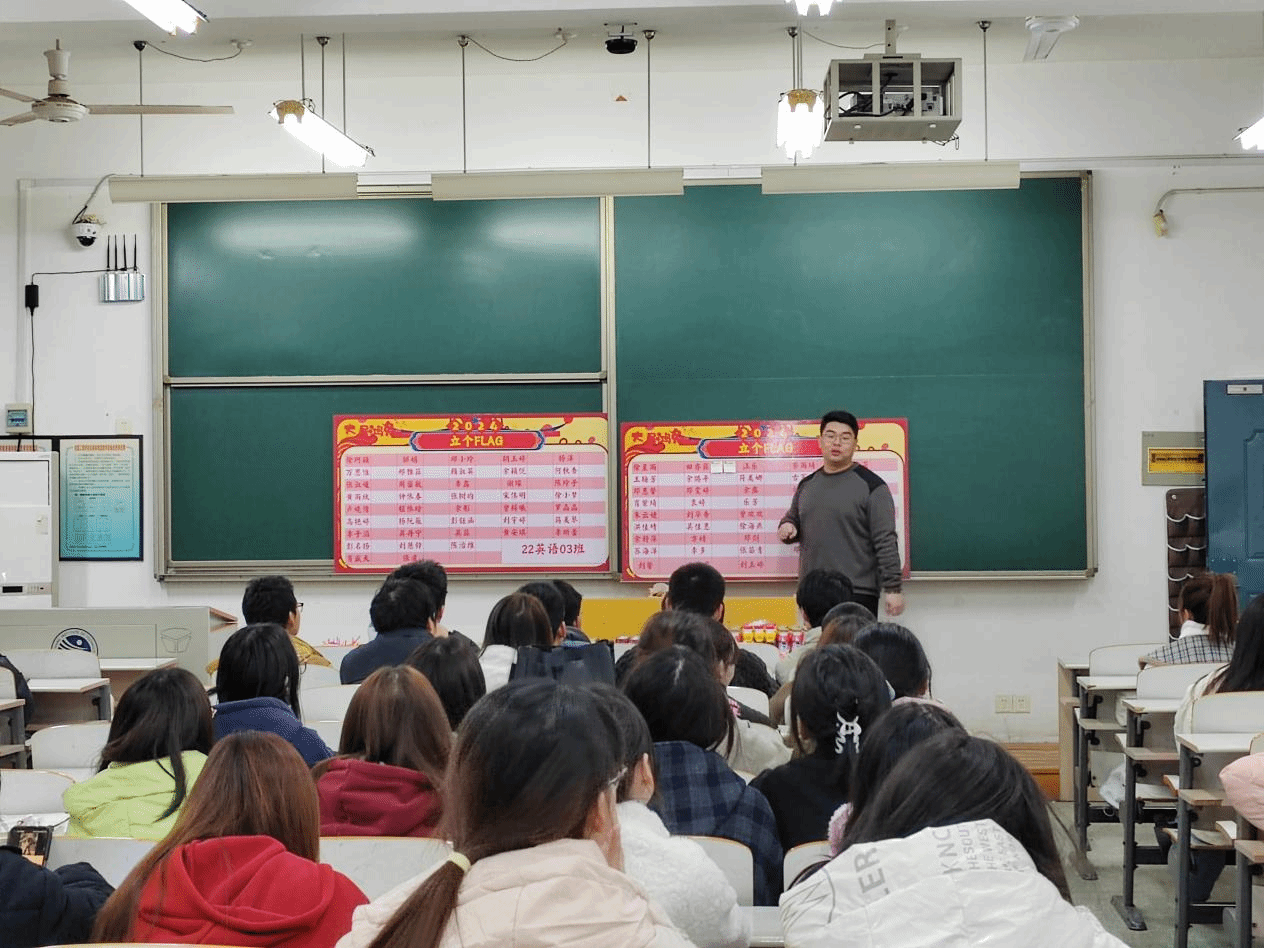 12月28日,外国语学院22英语03班和22翻译01班开展了“新年立下新flag”活动,在新的一年辞旧迎新,立下目标,同学们在班主任章昱的引导下总结本学期的收获与不足,并对新学期立下明确的目标、切实的规划。