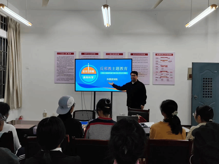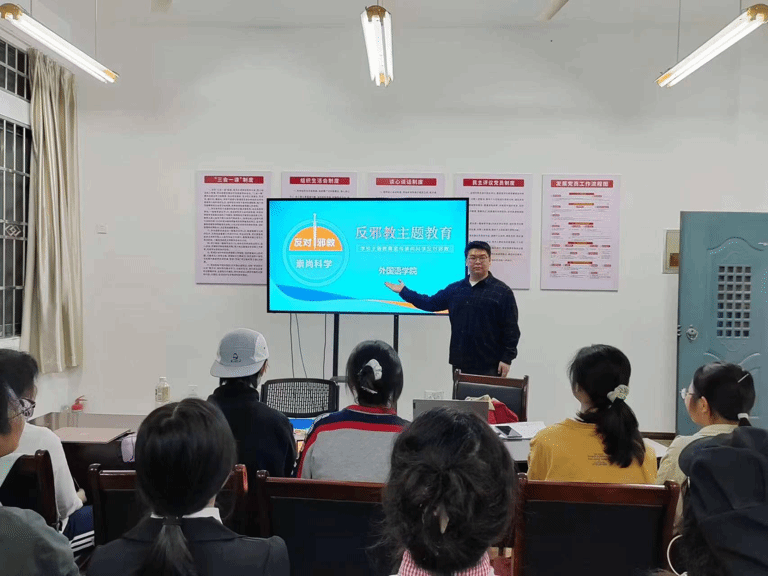 为了不断加强宣传教育和综合治理,进一步提高广大学生的识别、抵御和有效防范邪教的能力,近日,外国语学院在崇德楼A103举行了反邪教宣传教育活动。辅导员章昱主持此次会议。