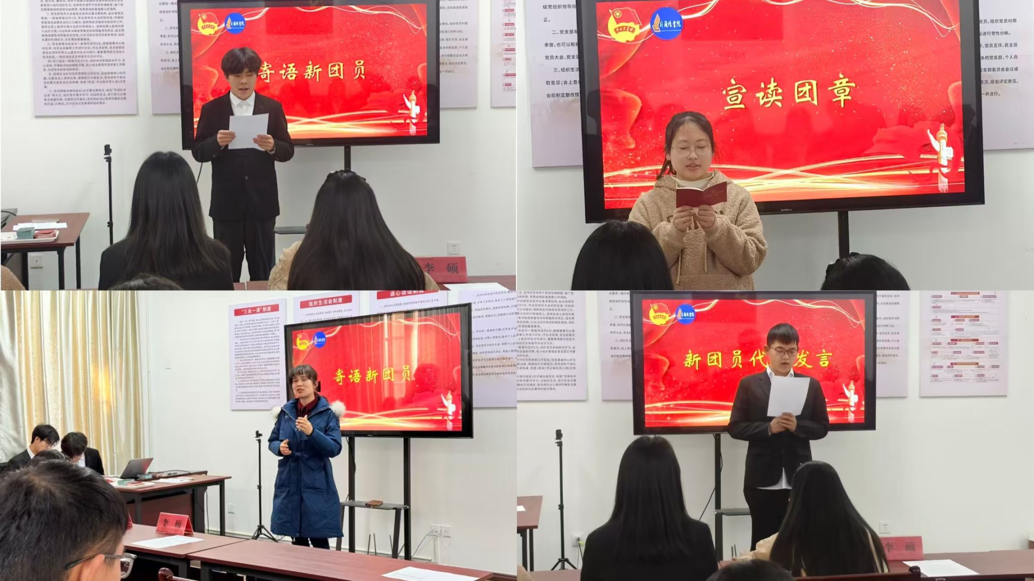 2025年12月30日下午,在崇德楼南A103举行外国语学院2025年第四、第五批新发展团员入团仪式。外国语学院党委副书记李硕、团委副书记谭酉群、学生会工作人员以及新发展的19名团员共同参与仪式。