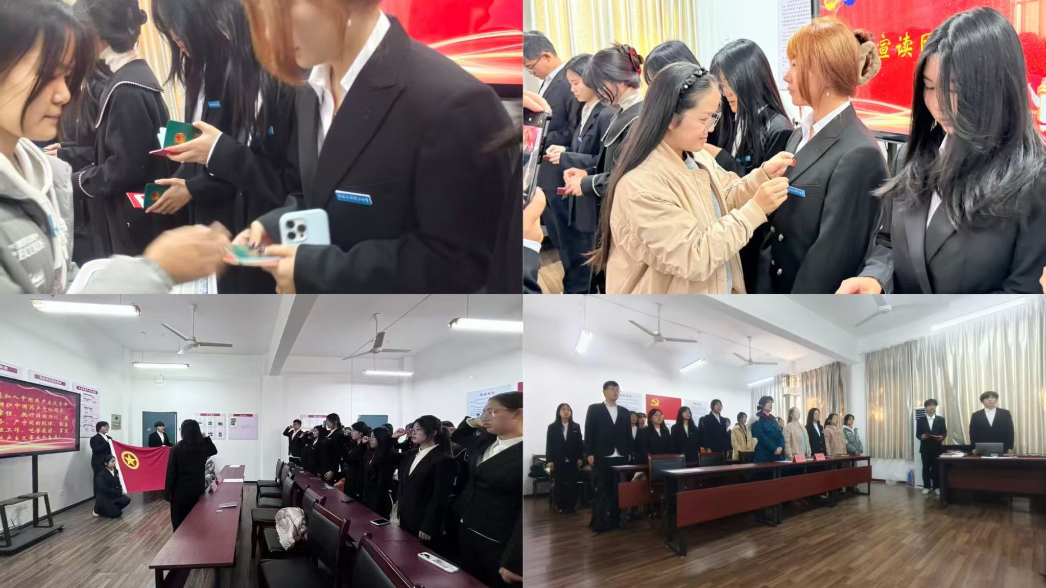 在庄严的国歌声中拉开仪式的序幕。首先工作人员宣布发展团员名单,并庄严宣读团章,谭酉群为新发展团员颁发团章、团员证并佩戴团徽。其次新团员代表陈斌斌同学上台分享入团感悟,再次表达担当团员责任的决心,而后李硕寄语新团员,勉励大家以入团为起点,将个人成长融入时代发展。最后新发展团员进行入团宣誓,铿锵誓言凸显青春担当。仪式在全场合唱中国共产主义青年团团歌中结束。