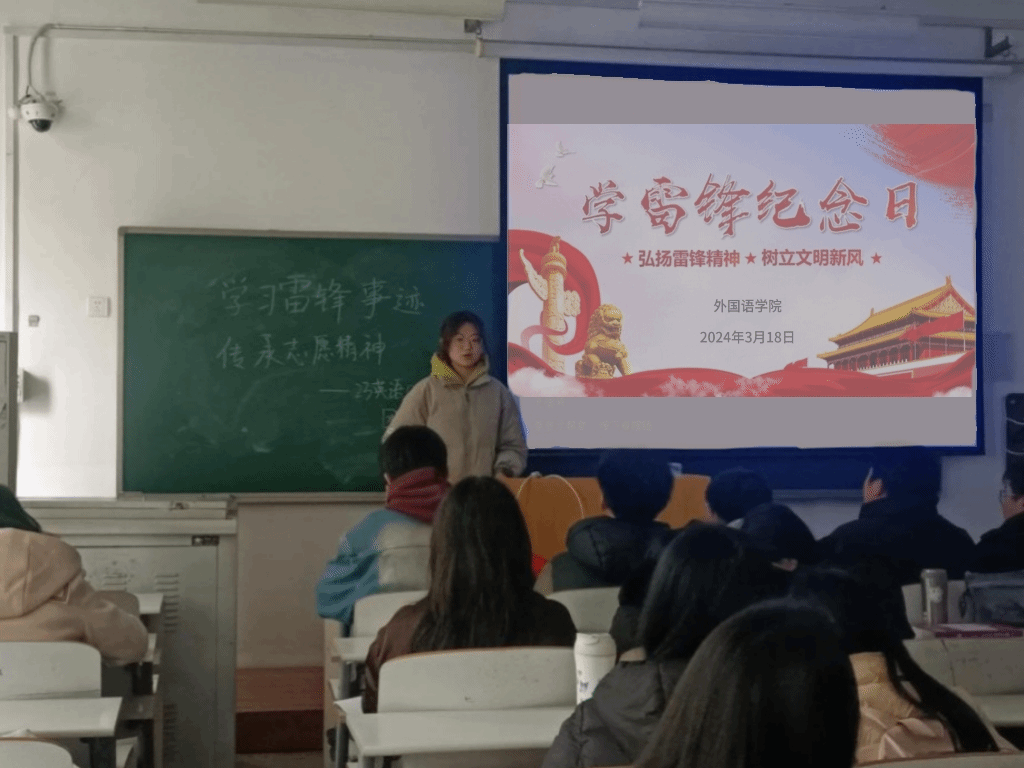 3月18日,为深入学习宣传贯彻党的二十大精神,弘扬奉献、友爱、互助、进步的志愿精神,外国语学院组织各班级开展“学习雷锋事迹,传承志愿精神”的主题团课活动。
